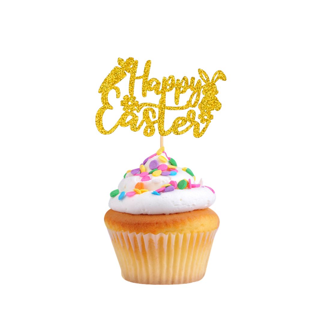 Create a cute Easter display with this 6-piece Happy Easter cupcake topper set. Perfect for cupcakes, dessert tables, and spring celebrations. Available in metallic gold or glitter cardstock in gold, silver, pink, light blue, purple, orange, or green to match your theme.